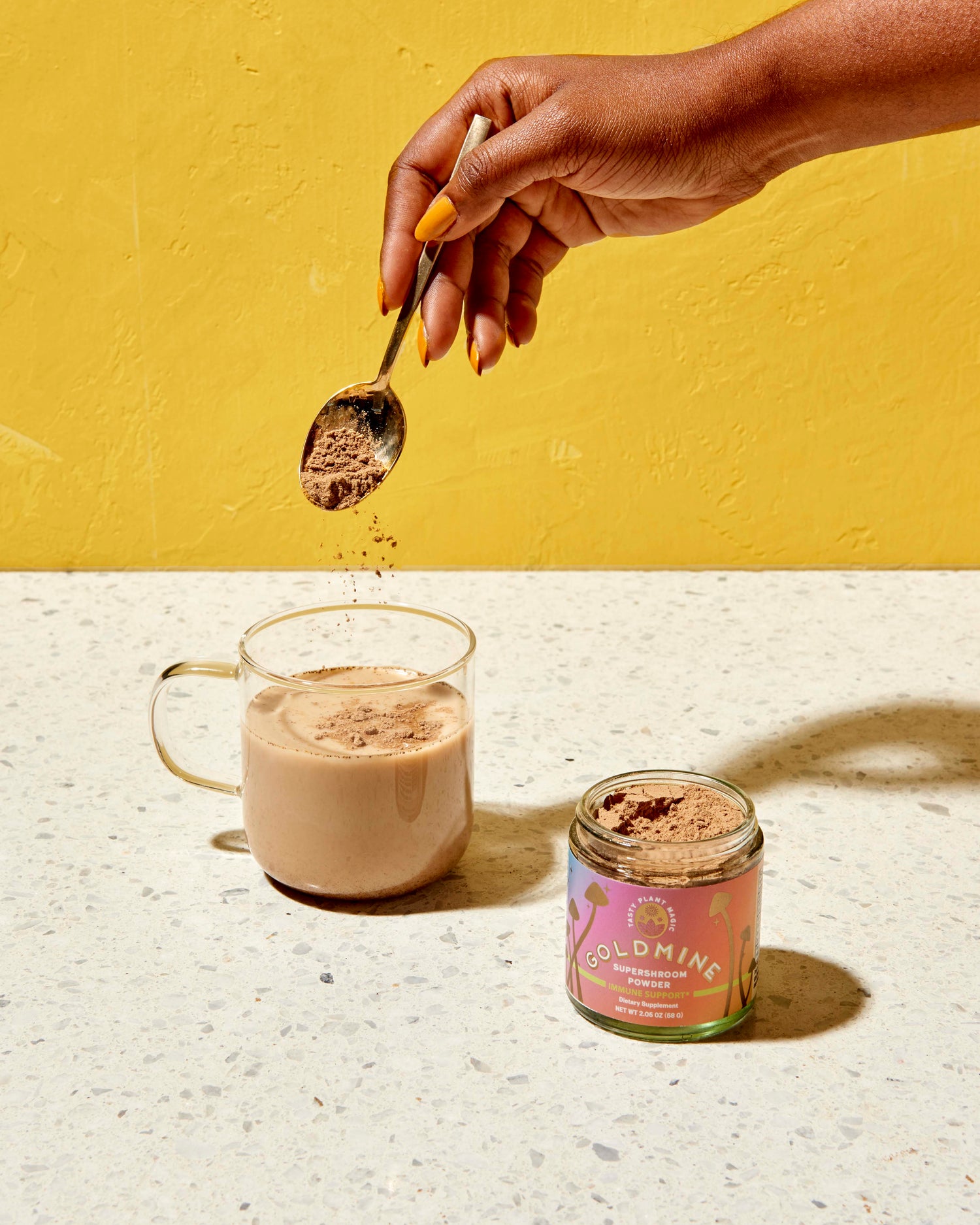 I add Goldmines Supershroom Daily Immunity Support and Daily Stress Management into my coffee every morning. It's become a beautiful part of my morning routine. I have a high stress job and feel like this little boost each day helps me stay balanced and healthy. The powder can take a little bit to break down so I like to put it in the bottom of my drip coffee filter before I add coffee beans instead of putting the powder directly into my mug.